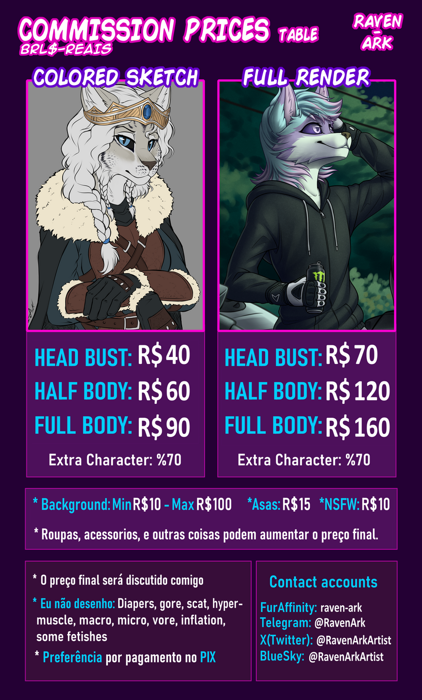 *Coisas que desenho: Personagens Antropomórficos (furry), Pôneis (MLP) , Animais Selvagens (feral), Cenários, Badges, Folhas de Referencia (Reference Sheets), Quadrinhos, NSFW.*Coisas que não desenho: Conteúdo de ódio (Racismo, Homofobia, Transfobia), Pedofilia, Zoofilia, Fetiches Extremos (Pergunte a mim).